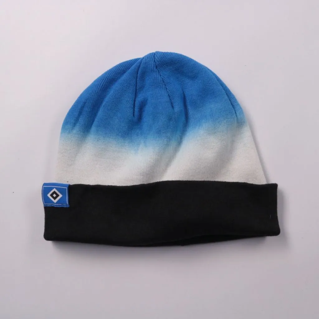 Трикотажная шапка-бини с градиентной расцветкой и подворотом, с нашивкой в стиле футбольного клуба HSV. Подойдёт для прохладной погоды в городе и на прогулках. Хлопковый материал хорошо дышит и комфортно сидит под капюшоном.