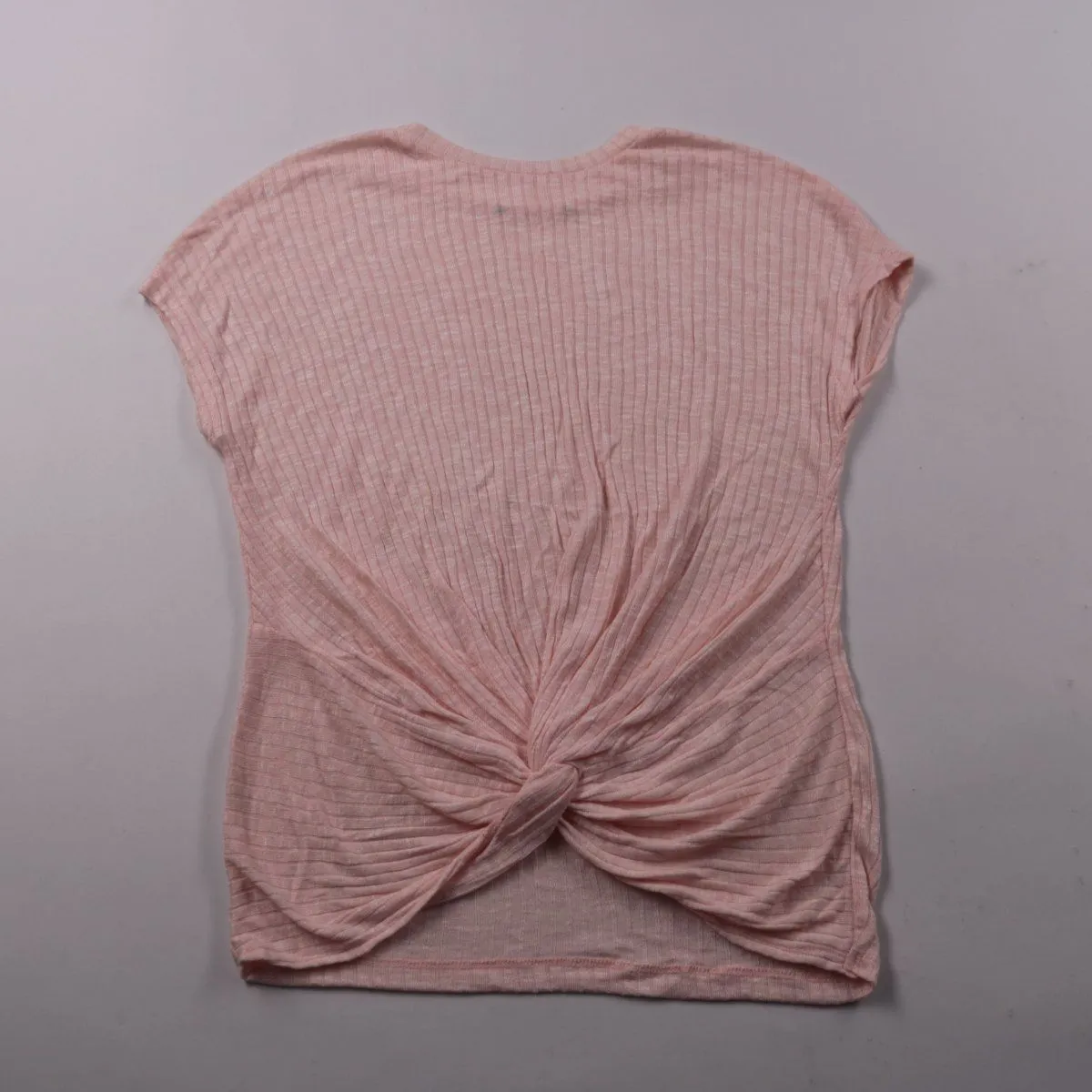 Розовая трикотажная футболка в рубчик с коротким рукавом и декоративным узлом спереди, бренд не указан. Подойдёт для повседневной носки летом или в помещении с юбкой, шортами или джинсами. Мягкий эластичный материал удобно сидит и не стесняет движений.