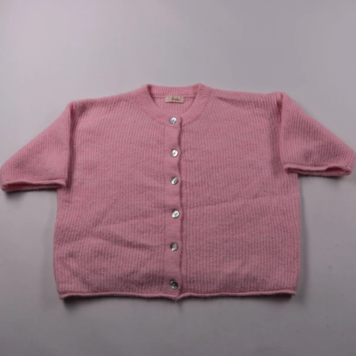 Вязаная кофта-кардиган Seelly розового цвета с коротким рукавом и застёжкой на пуговицы. Подойдёт для детского сада и прогулок в прохладную погоду, удобно носить как второй слой. Мягкий трикотаж хорошо тянется и не сковывает движения.