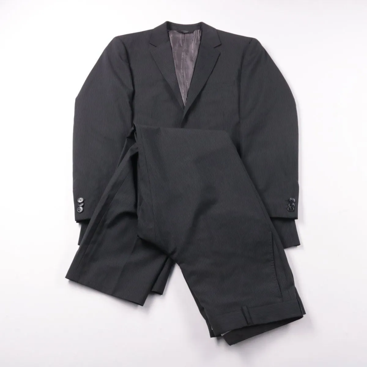 Мужской костюм Esprit Collection тёмно-серого (почти чёрного) цвета в тонкую полоску: пиджак и брюки. Подойдёт для офиса, деловых встреч и торжественных мероприятий. Практичный вариант — ткань на основе шерсти держит форму и выглядит аккуратно.
