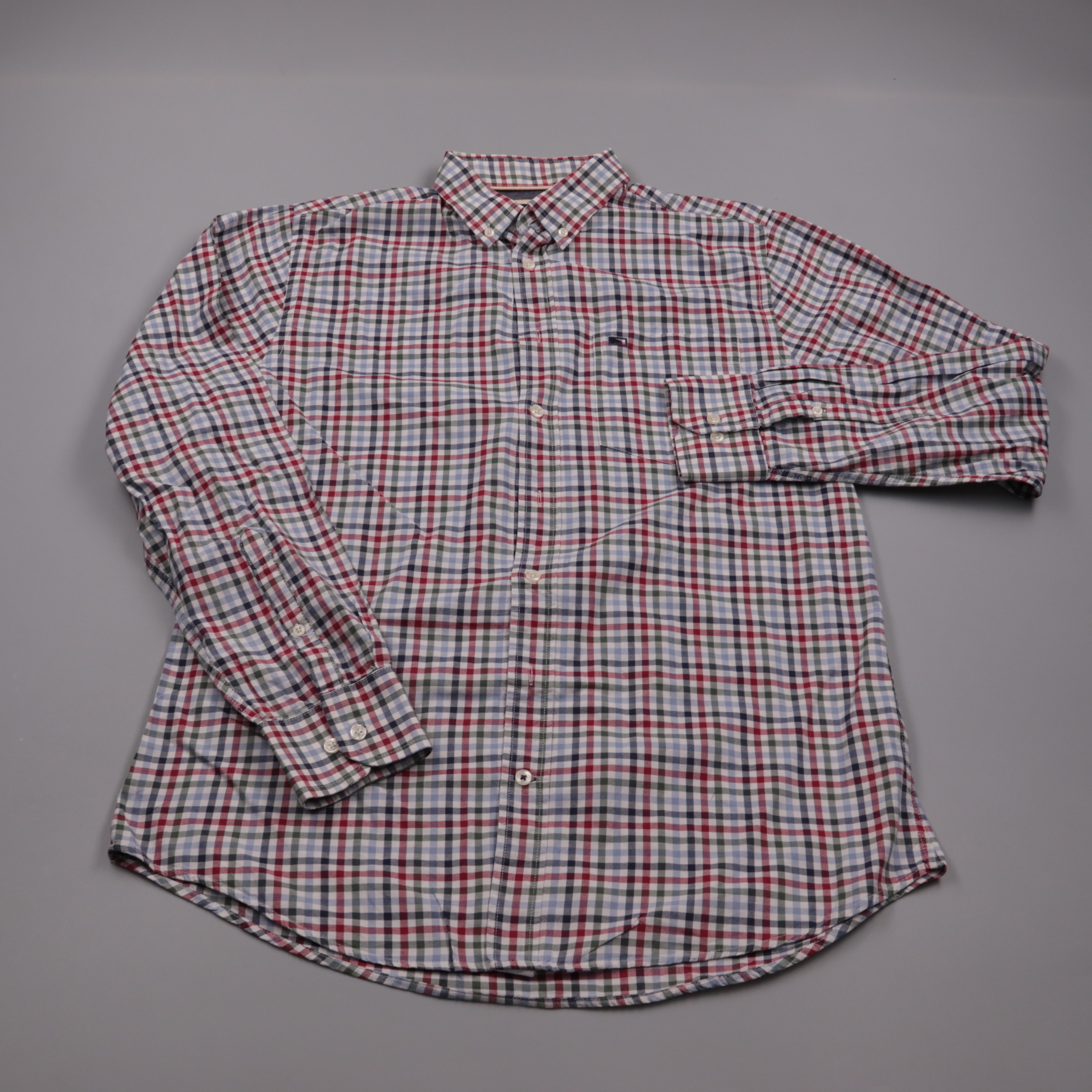Мужская рубашка Commander в мелкую клетку (белый/синий/красный), с длинным рукавом и воротником на пуговицах. Подойдёт для офиса в стиле casual и на каждый день, хорошо смотрится как с джинсами, так и с брюками. Натуральный хлопок приятен к телу и дышит.