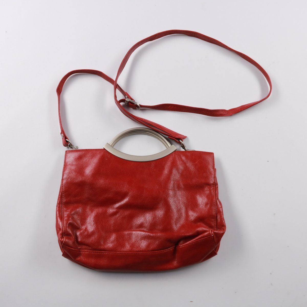 Женская красная сумка через плечо с жёсткой металлической ручкой и длинным ремнём. Подойдёт для города и повседневных дел, внутрь поместятся телефон, кошелёк и небольшая косметичка. Практичный плюс — удобное открывание сверху и дополнительный карман на молнии.