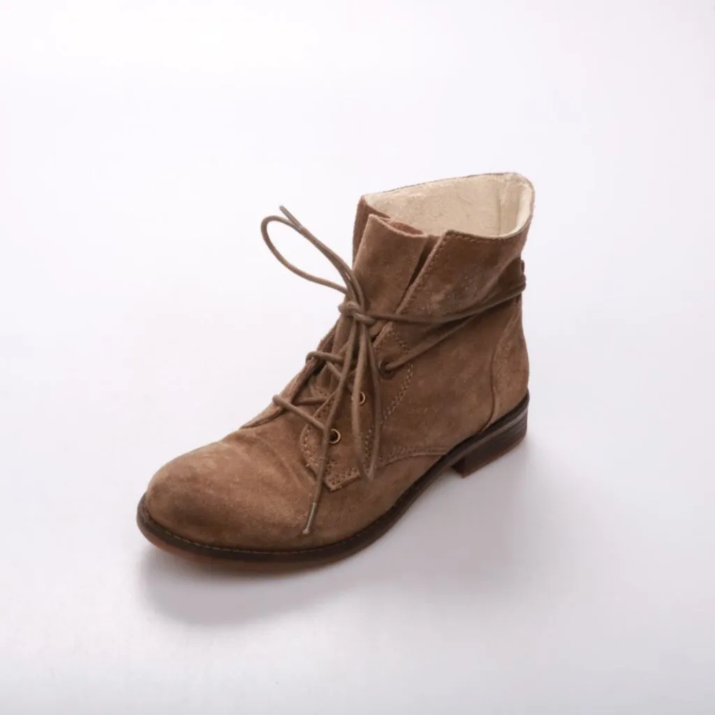 Замшевые ботильоны S.Oliver коричневого цвета на невысоком каблуке, со шнуровкой и мягким голенищем. Подойдут для повседневной носки в межсезонье и хорошо сочетаются с джинсами и платьями. Рельефная подошва даёт более уверенное сцепление на улице.
