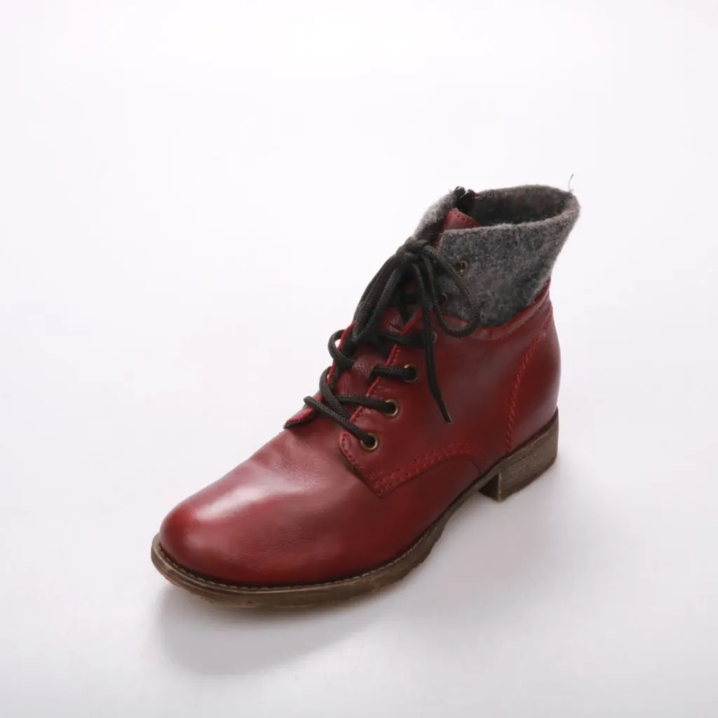 Женские ботильоны Rieker из красной кожи со шнуровкой и боковой молнией, с мягким серым войлочным манжетом. Подойдут на прохладную погоду в городе и для повседневной носки. Удобны тем, что молния позволяет быстро обуваться, а рельефная подошва даёт бол...