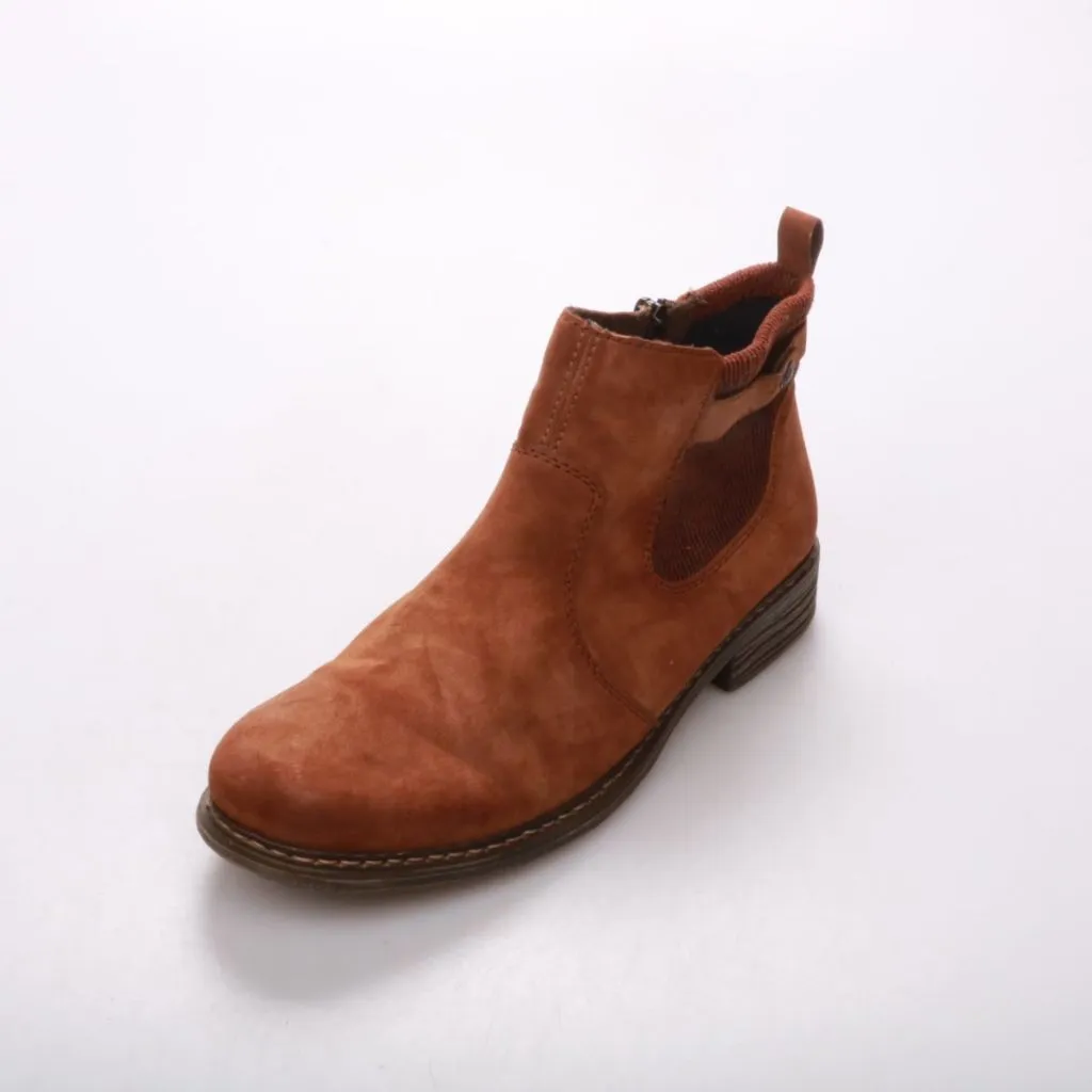 Ботильоны Rieker из коричневой замши, с боковой молнией и эластичной вставкой для удобной посадки. Подойдут на каждый день в межсезонье, под джинсы и брюки. Практичное преимущество — устойчивый низкий каблук и рельефная подошва.