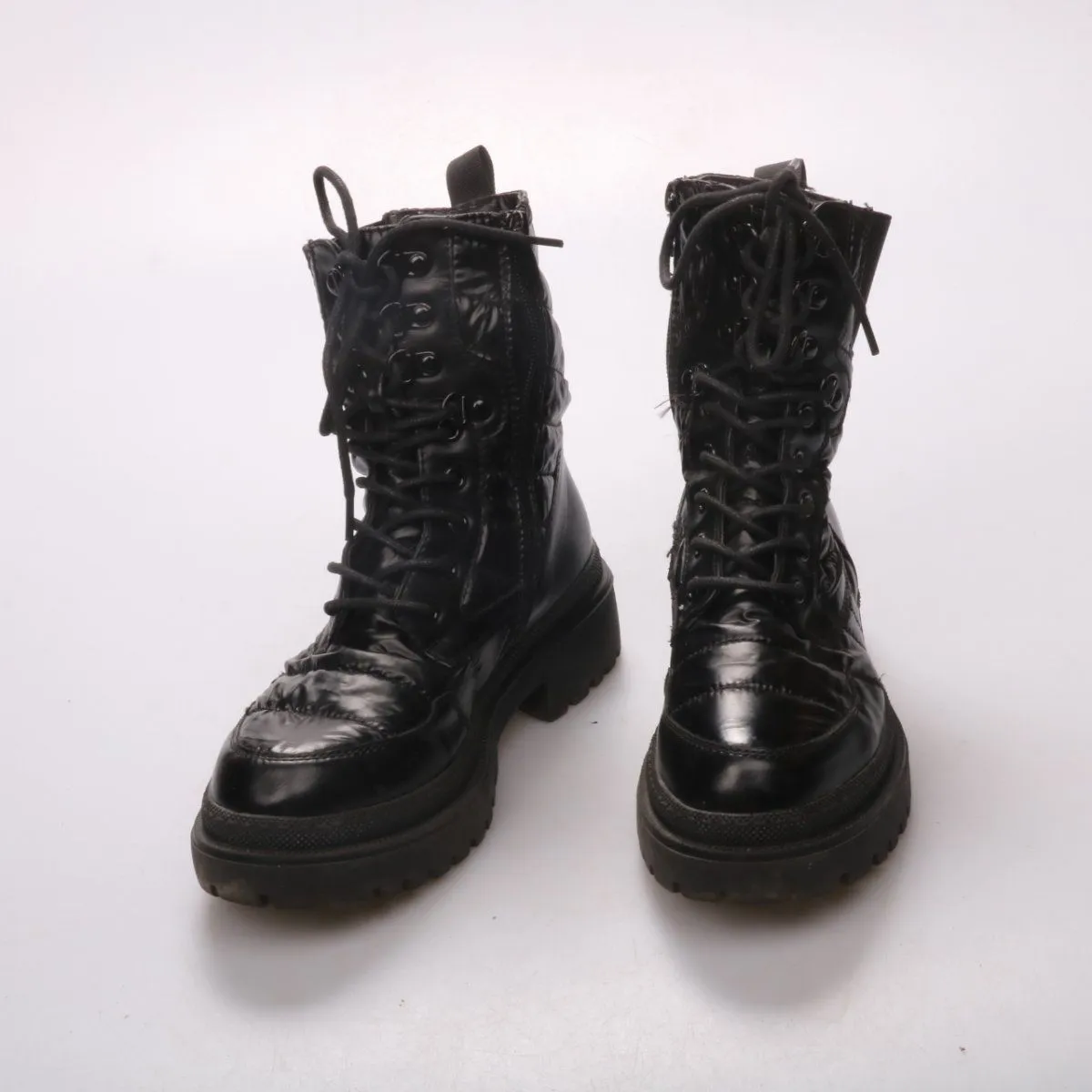 Высокие ботинки на шнуровке с боковой молнией и массивной рифлёной подошвой. Подойдут для зимних прогулок и повседневных образов, внутри выглядит как тёплая мягкая подкладка. Практичное преимущество — молния помогает быстро обуваться, а протектор даёт лучшее сцепление.