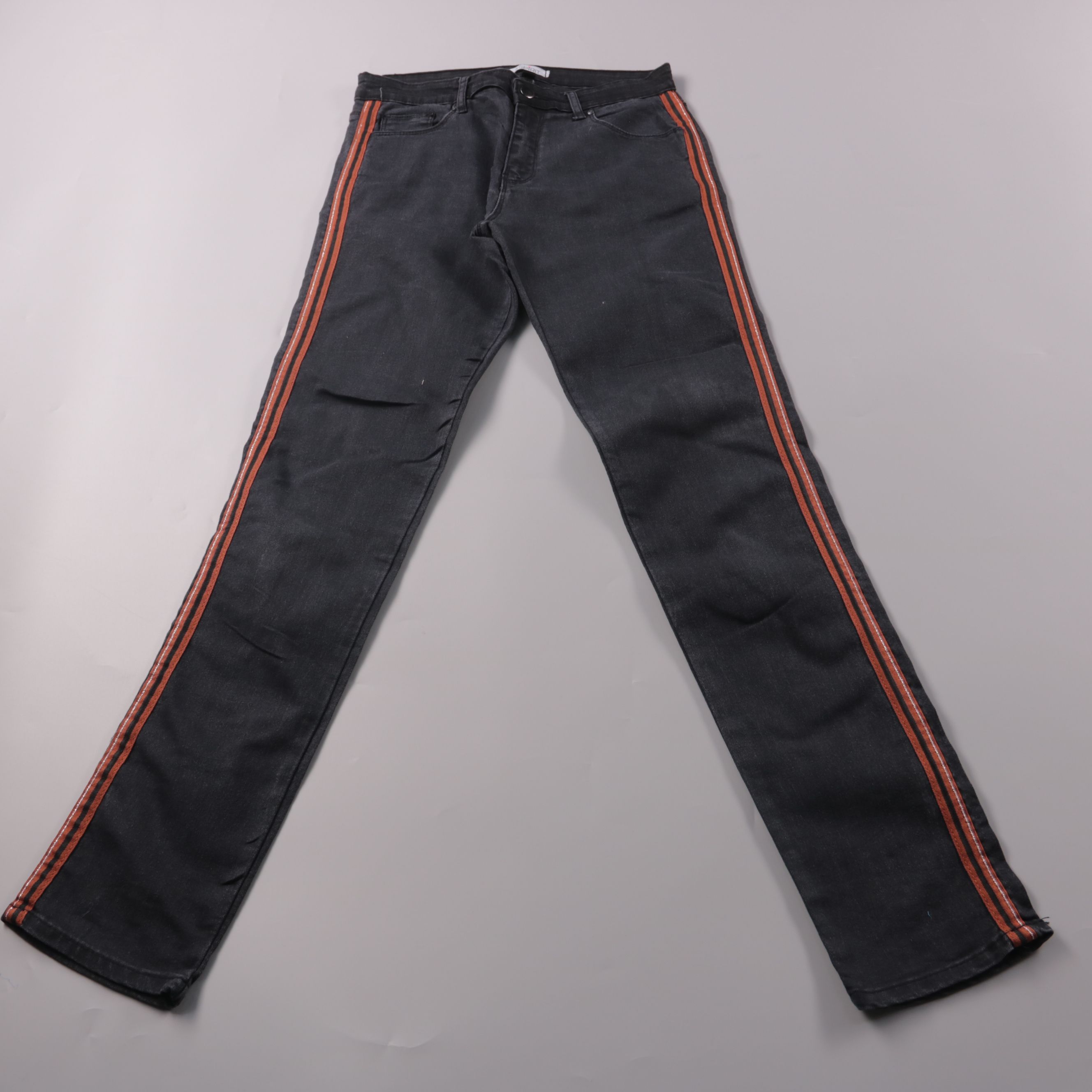 Женские чёрные джинсы the SPIRIT с контрастными оранжевыми лампасами по бокам. Подойдут для повседневных и streetwear-образов, ткань с эластаном лучше садится по фигуре. Практичны в носке за счёт плотного материала и удобной посадки.