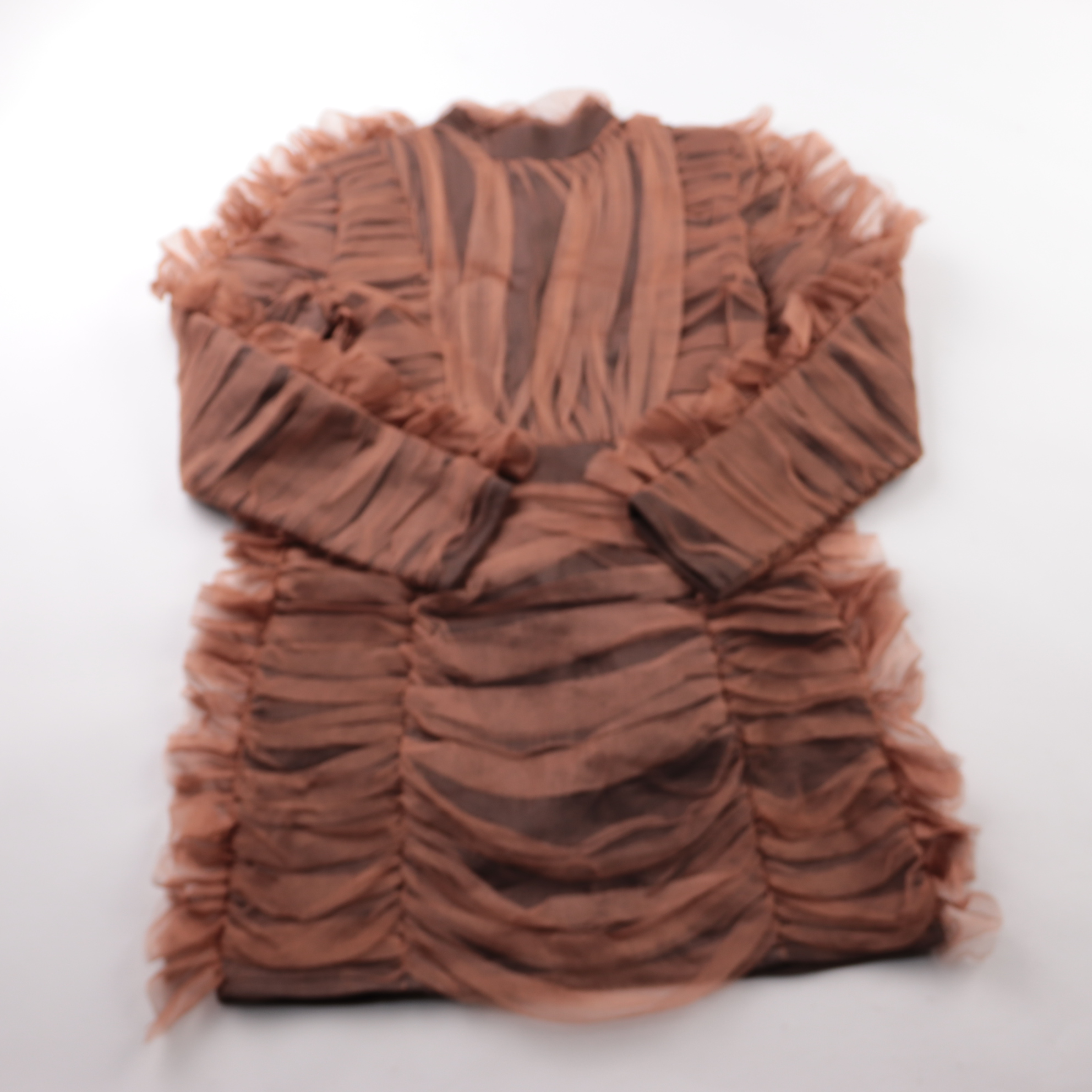 Вечернее платье PrettyLittleThing из полупрозрачной сетки с драпировкой и объёмными рюшами, цвет тёплый коричневый. Подойдёт для вечеринки или выхода, когда нужен акцентный образ. Эластичная подкладка помогает посадке и комфортно облегает фигуру.