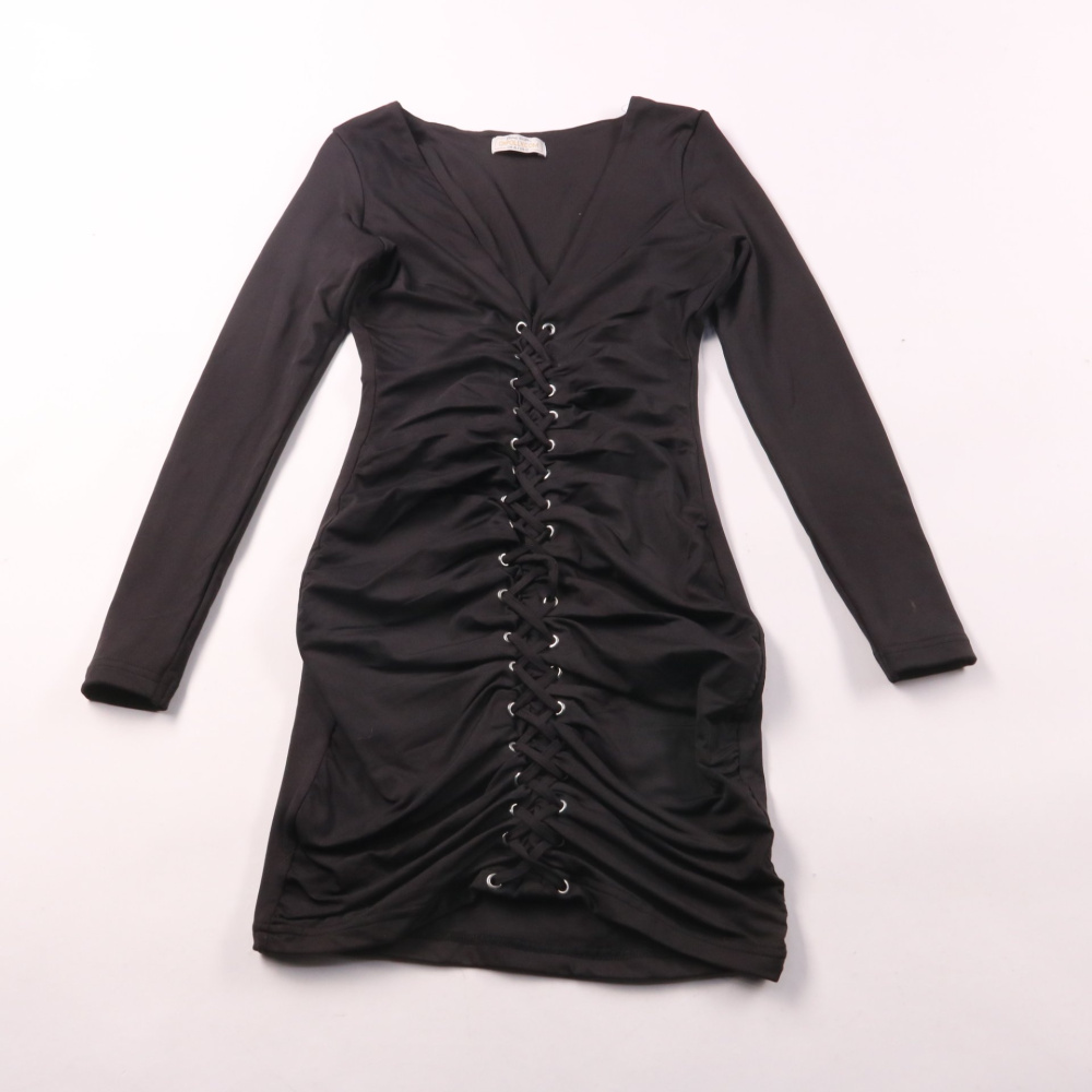 Черное облегающее мини-платье Oh Polly с длинным рукавом и V-образным вырезом. Спереди декоративная шнуровка и драпировка, поэтому отлично смотрится на вечеринке или выходе. Эластичная ткань хорошо садится по фигуре и почти не мнется.