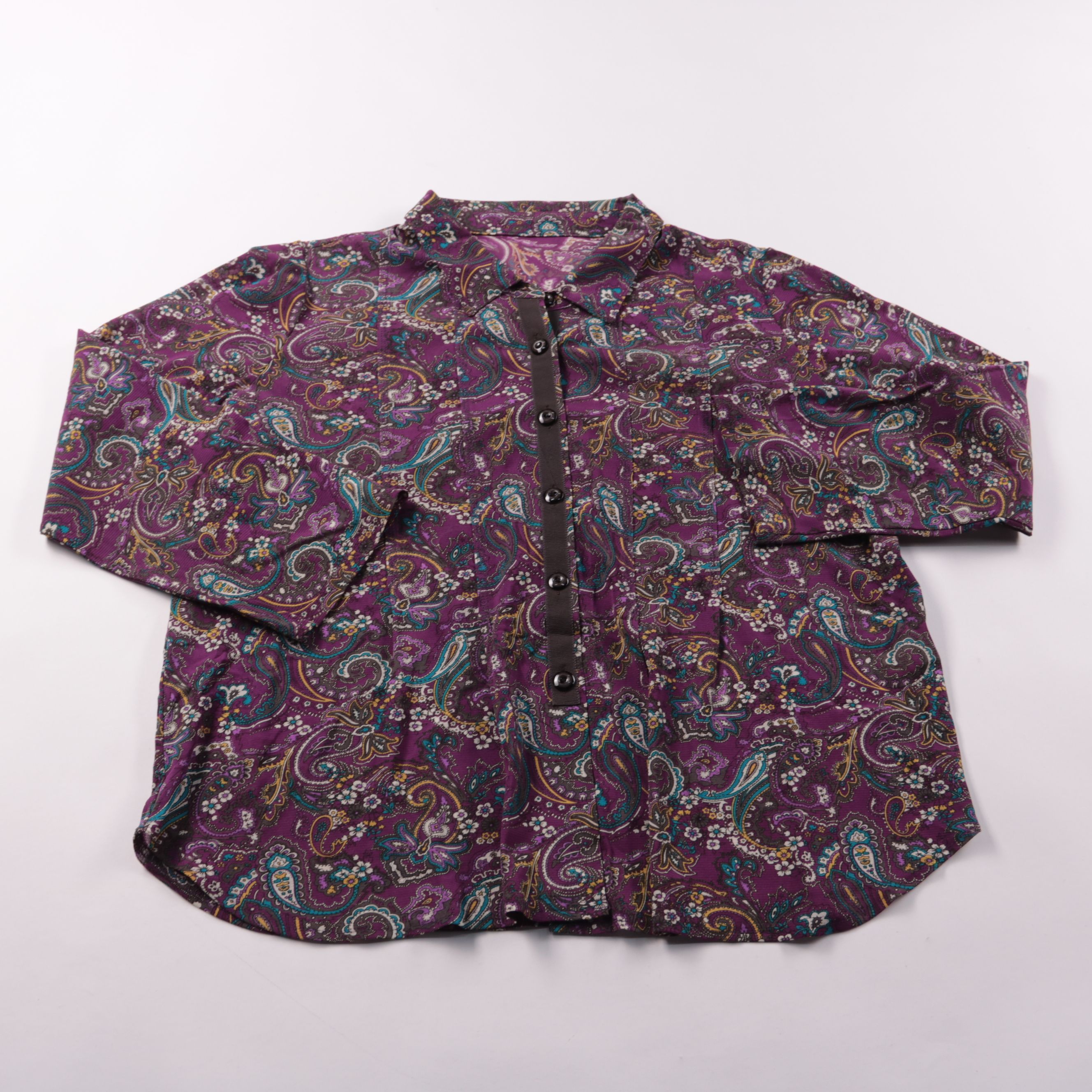 Женская блузка с длинным рукавом и застёжкой на пуговицы, с узором пейсли в фиолетовой гамме. Подойдёт для повседневных образов и офиса в сочетании с джинсами или однотонной юбкой/брюками. Практичное преимущество — рисунок хорошо скрывает мелкие следы ...