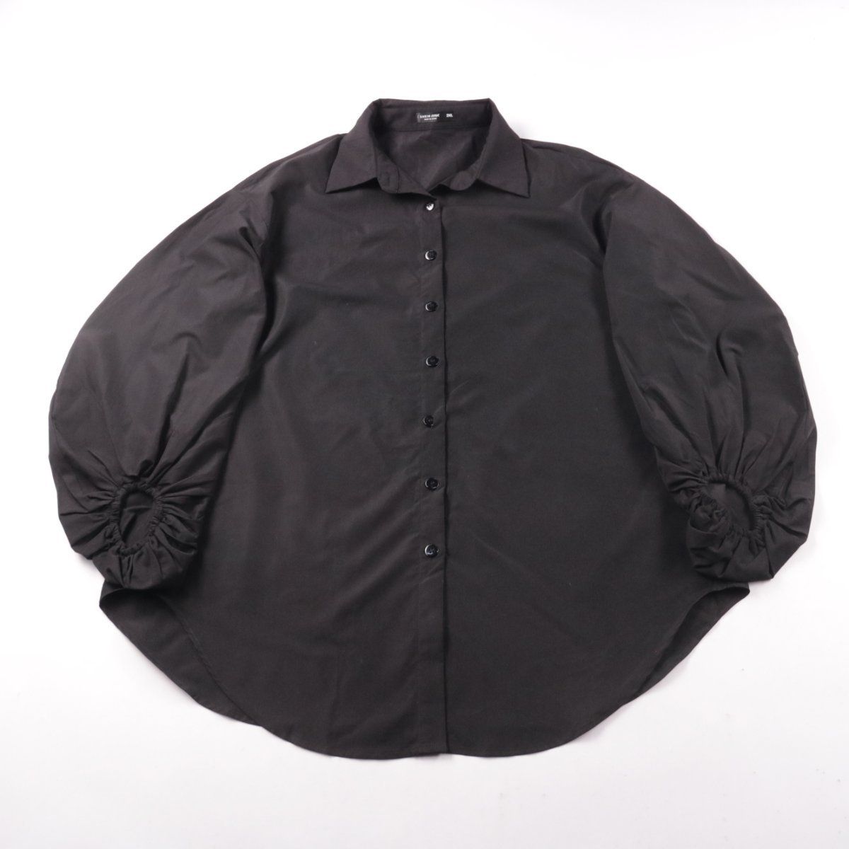 Чёрная блузка SHEIN CURVE на пуговицах с отложным воротником и объёмными рукавами на сборке. Подойдёт для офиса и повседневных образов с брюками или джинсами. Полиэстер практичен в уходе и меньше мнётся.