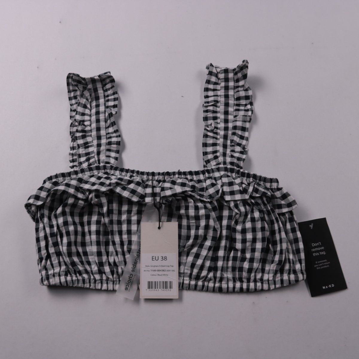 Укороченный топ NA-KD в чёрно-белую клетку (gingham) с эластичной сборкой и оборками на бретелях. Подойдёт для лета и тёплой погоды, хорошо смотрится с джинсами, юбкой или шортами. За счёт резинки комфортно сидит и подстраивается по фигуре.